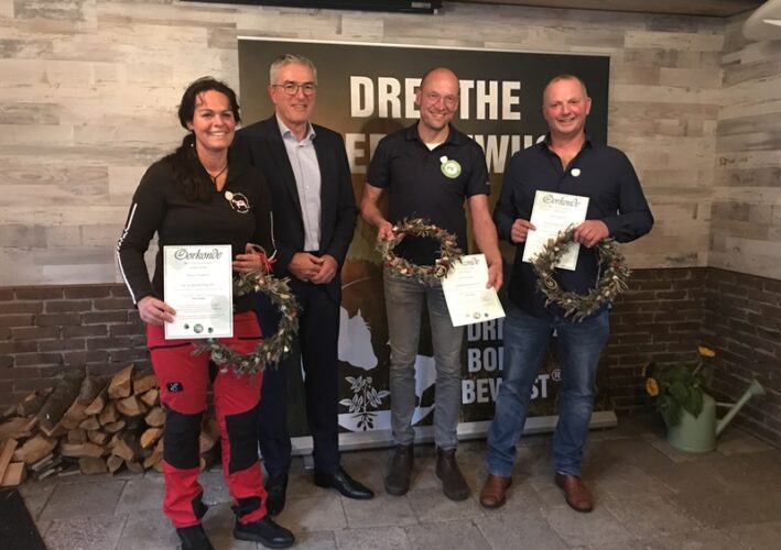 Op de foto: Naast Bernd Hietberg (tweede van rechts) ontvingen ook de melkveehouders Bianca Straathof en Peter Oosterhof een Drentse Waarde-Ring.